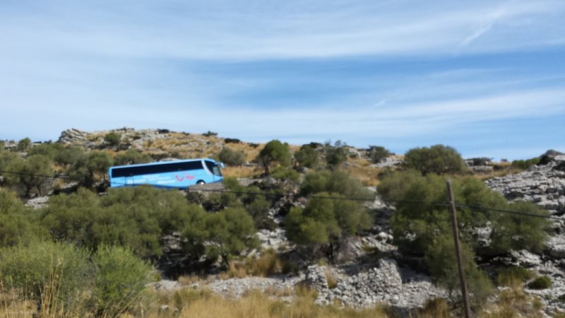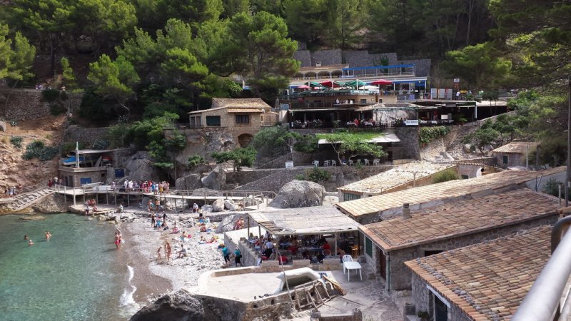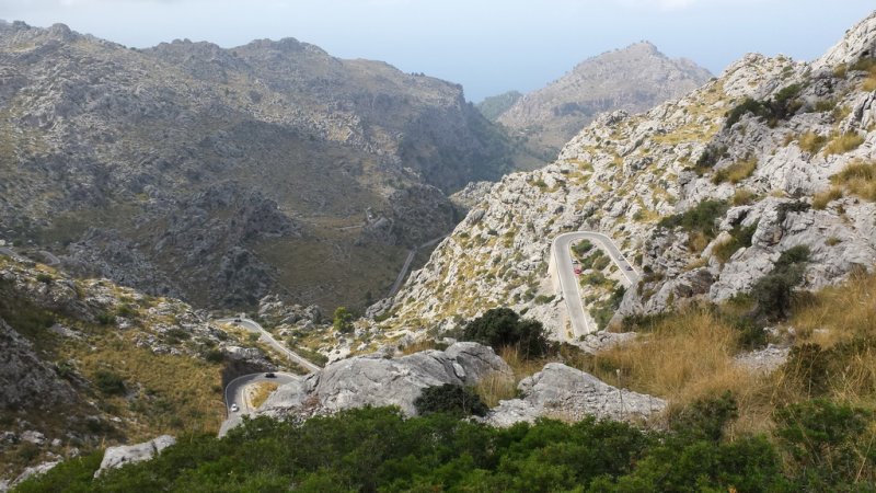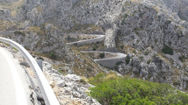 ...auch Tagesausflüge mit dem Bus nach Sa Calobra an. Rund 30 Kilometer nordwestlich von Palma de Mallorca fährst Du von der MA10 kommend auf die berühmte Straße MA2141, welche Dich über 12 Kilometer direkt zum Ort Sa Calobra führt. Die Straße hat es in sich und Du solltest schon ein geübter Fahrer sein, um die steilen und engen Kurven zu bewältigen. Immerhin hast Du 12 Haarnadelkurven und eine 270 Grad Kurve, bekannt als „Der Krawattenknoten“ zu passieren. Erbaut wurde die Serpentinstraße übrigens 1932 nach einer Planung des bekannten Ingenieurs Anotonio Paretti. Bis zum Bau dieser, konnte man Sa Calobra nur auf dem Seeweg oder zu Fuß durch den Torrent de Pareis erreichen. Am Ende der Straße angelangt, findest Du einen ausreichend großen, kostenpflichtigen Parkplatz. Von diesem geht es ein paar Meter zu Fuß weiter in den kleinen Ort Sa Calobra, welcher aufgrund der wenigen Häuser auch als Cases de sa Calobra bezeichnet wird. Sa Calobra mit seinen kleinen Steinhäusern,den Kiefern und den schroffen Felswänden, welche sich vom strahlend blauen Meer nach oben ziehen bietet unzählige Fotomotive. In den Restaurants am Port de Sa Calobra kannst Du Hunger und Durst stillen und Souvenirs erwerben. Außerdem befindet sich hier der Anleger für die Schiffe aus Port de Soller. Übrigens kannst Du am rund 50 Meter langen Kiesstrand, der Platja de sa Calobra wunderbar Baden.